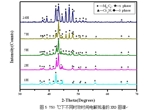 (2)750 ℃時效1 h后,析出相主要是以M23C6和Cr2N為主, 到2小時,χ相開始形成;5 h以后則有部分σ相出現,而后伴隨著時間的延長,σ相越來越多,相應χ相開始減少,到24 h時,σ相已經占主導地位,且形成的晶體很完整,XRD圖譜峰和清晰明顯。