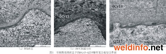在壓力容器行業(yè)中,特別是一些用于化學(xué)工業(yè)的設(shè)備,由于長期在具有腐蝕性的環(huán)境中服役,因此對其制造材料的耐腐蝕性能有很高的要求。如果用單一的耐腐蝕材料進行制造,雖然滿足了使用要求,但是大大提高了生產(chǎn)成本。可以考慮在保證材料強度和使用性能的前提下,通過在價格相對便宜的基板上復(fù)合一層耐腐蝕板材來達到降低成本的目的[1]。 本文以0Cr13不銹鋼-Q235碳鋼爆炸不銹鋼復(fù)合板為試驗對象,研究了不同熱處理時長對其結(jié)合界面在組織形態(tài)、元素擴散及顯微硬度等方面的影響,為確定合適的熱處理時間提供了理論指導(dǎo)。